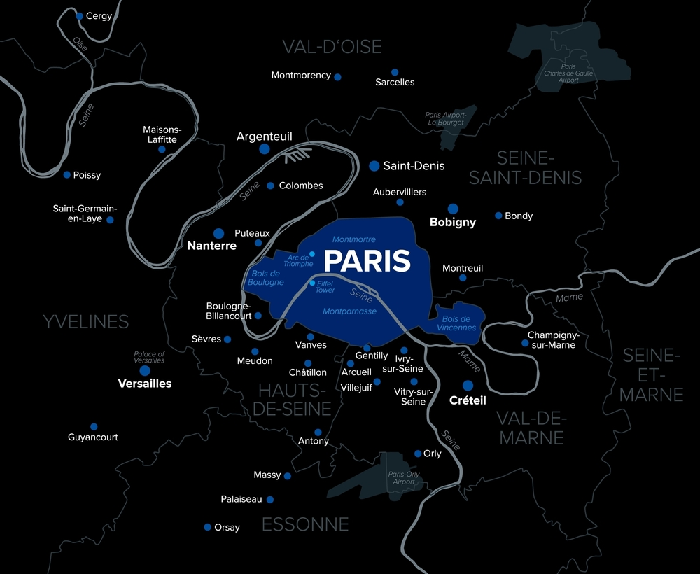 - Petite couronne : Hauts-de-Seine (92), Seine-Saint-Denis (93), Val-de-Marne (94) — directement adjacents à Paris.